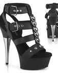 6" (152mm) Chrome Plated Heel, 1 3/4" (44mm) Platform Strappy Closed Back Cage Style Sandal Featuring Two Adjustable Buckle Straps, Cone Studs and Hardware Accents Going Up the Middle of the Shoe