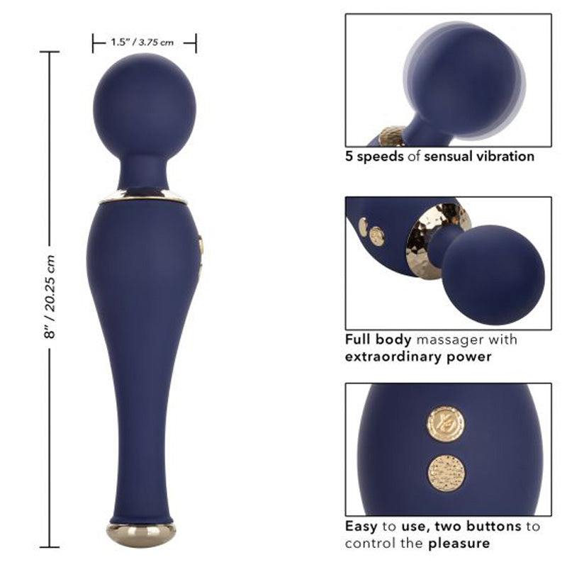 Indulge in personalized pleasure while the curved massager shimmies to the rhythm of 5 sensation speeds of vibration. Control this variety of orgasmic options with the easy-touch control pad. The flexible massager is made from a hygienically superior silicone with dazzling gold plated decorative accents.