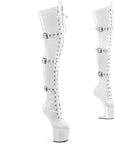 8" (200mm) Heelless, 3" (76mm) Platform Stretch Lace-Up Front Triple Buckle Strap Thigh High Boots, Full Length Inner Side Zip Closure. Convertible to Wedge Boots with Included Heel Attachments. **WARNING: Extreme Height and Unique Heelless Design. Not Recommended for Walking or Dancing.