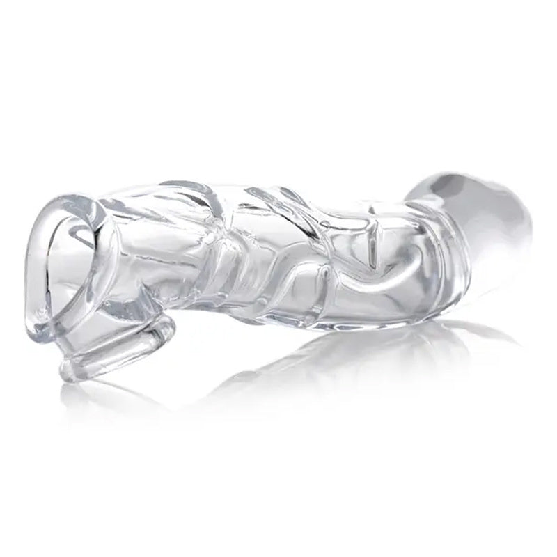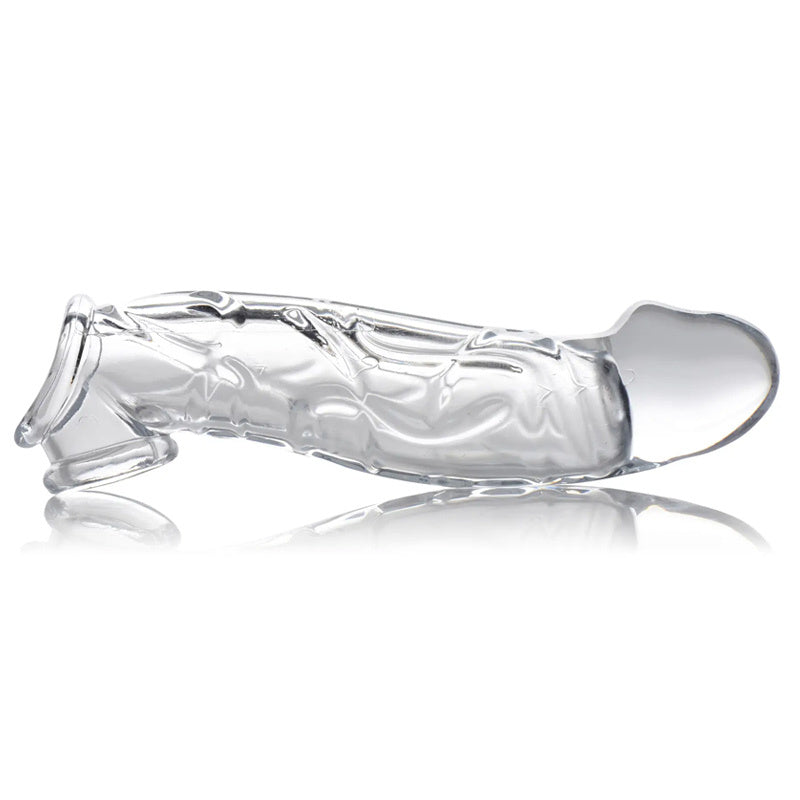 This extender sleeve gives you two whole inches of solid penis to plow into your partner! The realistic texture, featuring a bulbous head and bulging veins, along with a subtle curved shape will deliver a new kind of internal massage. Just lube up and put your entire package through the first hole, allowing your scrotum to go through the bottom hole for a satisfying stretch. The solid 2 inch tip is followed by a hollow interior that allows for a snug and secure fit. This body-safe and phthalate-free material is compatible with silicone and water-based lubricants. Use warm water and mild soap or a toy cleaner to clean after use.