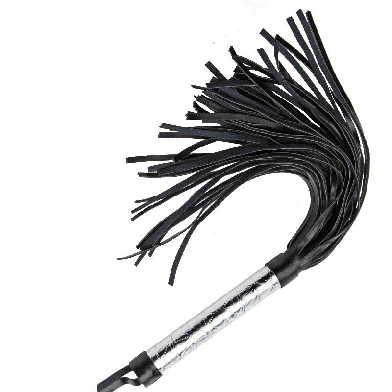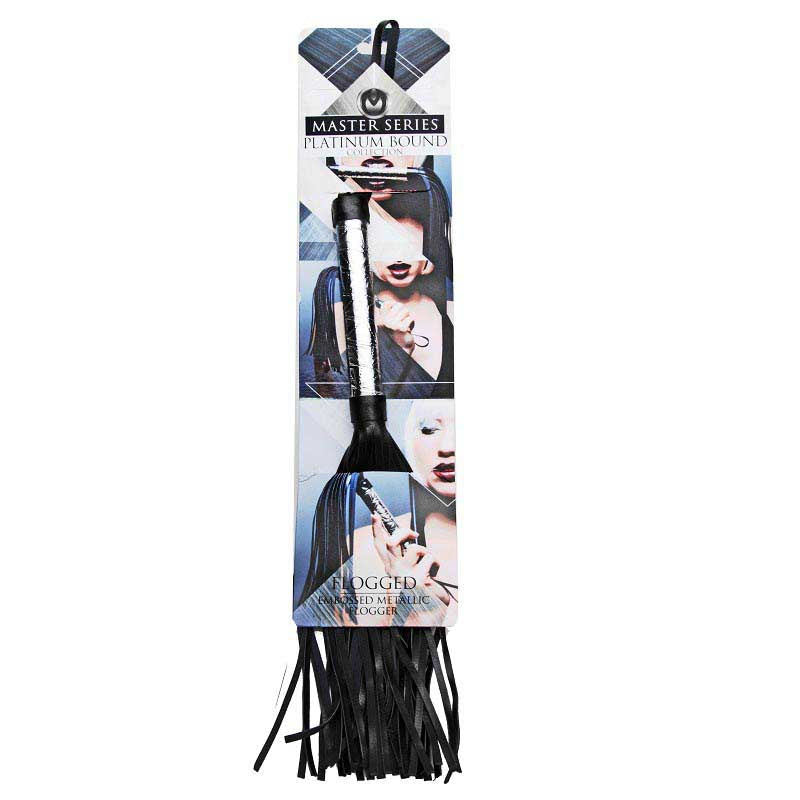This platinum-handled flogger is made of man-made materials, accented with silver for a stunning display. The stiff tails provide an intense sting upon impact, with an embossed diamond-pattern handle that will shine with every swing. The looped handle is ideal while in use or for storage and hanging.