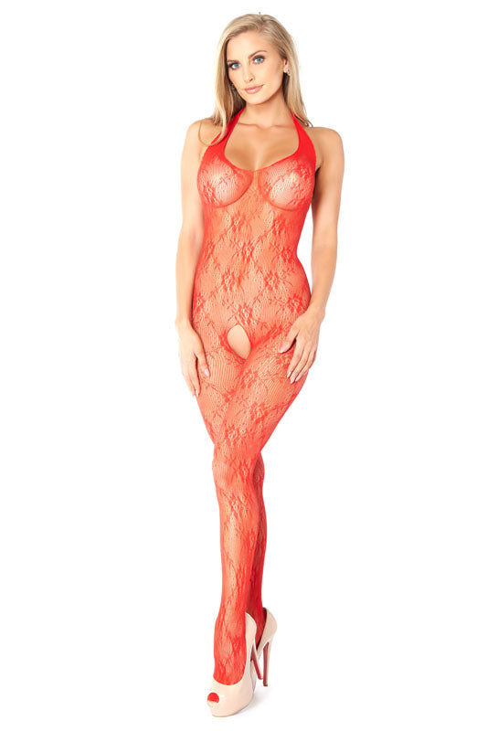 Red Hot Ride. All over lace halter bodystocking with open crotch.